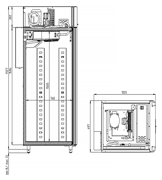 Каталог оборудования Холодильное оборудованиеШкафы холодильныеСпециализированные холодильные шкафыШкаф холодильный для хлебопекарных производств Polair CS107-Bakery Br со стеклом (Тип 2) Шкаф холодильный для хлебопекарных производств Polair CS107-Bakery Br со стеклом (Тип 2) Код товара: 062-623 Поделиться: WhatsAppTelegram СравнитьДобавить в КПВ избранное 0 419 900 ₽ В корзину 0 шт Под заказСамовывоз сегодня бесплатно Взять в кредит Купить в лизинг Получить консультацию в WhatsApp Описание Характеристики Отзывы 0 Инструкции 5 Шкаф холодильный для хлебопекарных производств Polair CS107-Bakery Br со стеклом (Тип 2) предназначен для создания оптимальных условий хранения и расстойки заготовок из теста на предприятиях общественного питания и торговли. Корпус цельнозаливной, выполнен из нержавеющей стали, дверь — стеклопакет. Оборудование стабильно работает при температуре окружающей среды до +40 °C. В комплект входят 20 пар направляющих размером 400×600 мм. Особенности: Многофункциональные режимы: охлаждение тестовых заготовок, замедление ферментации, хранение, регенерация, брожение и расстойка Динамическое охлаждение с мягким обдувом без заветривания и автоматическая оттайка с системой испарения конденсата Панель управления с 7" дисплеем: контроль температуры, влажности (регулируется от 60 до 95 %), скорости вентилятора и времени, возможность создания и сохранения собственных программ Встроенный ультразвуковой увлажнитель (требуется подключение к системе водоочистки и канализации) Эргономичная конструкция: верхнее расположение агрегата, распашная дверь со стеклопакетом и механизмом самозакрывания, педаль для удобного открытия, съёмные направляющие и легко заменяемый уплотнитель с магнитной вставкой Простота ухода: штампованное углубление в дне корпуса для сбора загрязнений Экологичный хладагент R290 Энергоэффективность: потребляемая мощность — 0,55 кВт (охлаждение), 0,9 кВт (нагрев) Толщина стенки корпуса — 43 мм Polair CS107-Bakery Br со стеклом (Тип 2) — современный шкаф отложенной расстойки, обеспечивающий полный контроль и гибкость при работе с тестовыми заготовками. Благодаря многофункциональным режимам, точной настройке параметров и продуманной конструкции, он становится надёжным решением для пекарен и кондитерских, стремящихся к высокому качеству продукции и удобству в эксплуатации.Изображение товара, представленного на фото, может отличаться от его фактического вида. Показать все Габаритные размеры697×1005×1960 ммДиапазон рабочей температурыот -10 до +40 °CДлина697 ммШирина1005 ммВысота1960 ммОбъём700 лКол-во дверей1 Тип двериСтеклянная Уровень влажностиот 60 до 95 %Направляющие под EN 40*6020 Расстояние между направляющими60 ммХолодильный агрегатВстроенный Тип оттайкиАвтоматическая Тип охлажденияДинамический ПодсветкаЕсть ХладагентR290 Вес нетто180 кгВес брутто205 кгБрендPolairВсе специализированные холодильные шкафы Из нержавейки Оставить отзыв Еще никто не оставил отзыв на этот товар Схема POLAIR CS107 Bakery Br.jpgИнструкция на POLAIR CS107 Bakery Br.pdfБрошюра на хлебопекарное оборудование POLAIR.pdfДекларация о соответствии.pdfСертификат соответствия.pdf Похожие товары Перейти в каталог Под заказ 169 915 ₽ Шкаф холодильный для хлебопекарных производств Polair CS107 Bakery Bs Под заказ 252 314 ₽ Шкаф холодильный для вызревания мяса и сыра Carboma M700GN-1-G-MHC 9005 Под заказ 389 300 ₽ Шкаф холодильный для вызревания мяса Polair CS107 Meat (Т