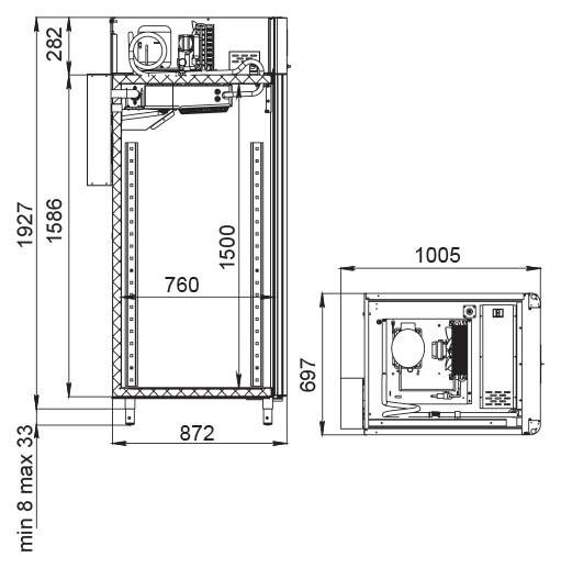 Каталог оборудования Холодильное оборудованиеШкафы холодильныеСпециализированные холодильные шкафыШкаф холодильный для вызревания салями Polair CS107 Salami Шкаф холодильный для вызревания салями Polair CS107 Salami Код товара: 009-391 Поделиться: WhatsAppTelegram СравнитьДобавить в КПВ избранное 0 390 915 ₽ В корзину 0 шт Под заказСамовывоз сегодня бесплатно Взять в кредит Купить в лизинг Получить консультацию в WhatsApp Описание Характеристики Отзывы 0 Инструкции 5 Шкаф холодильный для вызревания салями Polair CS107 Salami предназначен для приготовления и хранения салями, сыровяленых колбас и других мясных деликатесов на предприятиях общественного питания и торговли. Монолитный цельнозаливной корпус выполнен из нержавеющей стали снаружи и внутри (кроме задней стенки), что обеспечивает высокую прочность, устойчивость к коррозии и долгий срок службы. Оборудование рассчитано на работу при температуре окружающей среды до +40 °С. Особенности: Верхнее расположение агрегата Русифицированная многофункциональная панель управления с дисплеем диагональю 5" Возможность создания и сохранения индивидуальных программ Три уровня подвесов с тремя перекладинами и крюками на каждом для развески колбас Встроенный ультразвуковой увлажнитель (требуется подключение к системе подачи очищенной воды и к канализации) UV-лампа для обеззараживания воздуха внутри камеры Регулируемый уровень влажности: от 60 до 95 % Распашная дверь с заливной теплоизоляцией, встроенной ручкой и магнитным уплотнителем Отключаемая внутренняя LED-подсветка Штампованное углубление в дне корпуса для удобства ухода Педаль для комфортного открытия двери Толщина стенки корпуса: 43 мм POLAIR CS107 Salami — это профессиональное решение для предприятий, специализирующихся на производстве мясных деликатесов. Шкаф обеспечивает точный контроль температуры и влажности, способствует правильной ферментации и дозреванию продукции, а также гарантирует гигиеничность и удобство эксплуатации. Это надёжное оборудование поможет сохранить вкус, текстуру и качество готовых изделий на высоком уровне.Изображение товара, представленного на фото, может отличаться от его фактического вида. Показать все Габаритные размеры697×1005×1960 ммДиапазон рабочей температурыот -2 до +30 °CДлина697 ммШирина1005 ммВысота1960 ммОбъём700 лКол-во дверей1 Тип двериМеталлическая Уровень влажностиот 60 до 95 %Холодильный агрегатВстроенный Тип оттайкиАвтоматическая Тип охлажденияДинамическое ПодсветкаЕсть UV-лампаДа ХладагентR290 Вес нетто144 кгВес брутто171 кгБрендPolair Оставить отзыв Еще никто не оставил отзыв на этот товар Схема POLAIR CS107 Salami.jpgИнструкция на POLAIR CS107 Salami.pdfБрошюра на POLAIR CS107 Salami.pdfДекларация о соответствии.pdfСертификат соответствия.pdf Похожие товары Перейти в каталог Под заказ 389 300 ₽ Шкаф холодильный для вызревания мяса Polair CS107 Meat (Тип 1) Под заказ 391 000 ₽ Шкаф холодильный для вызревания мяса Polair CS107 Meat (Тип 2) С этим товаром покупают Под заказ 97 500 ₽ Конвекционная печь Abat КЭП-3