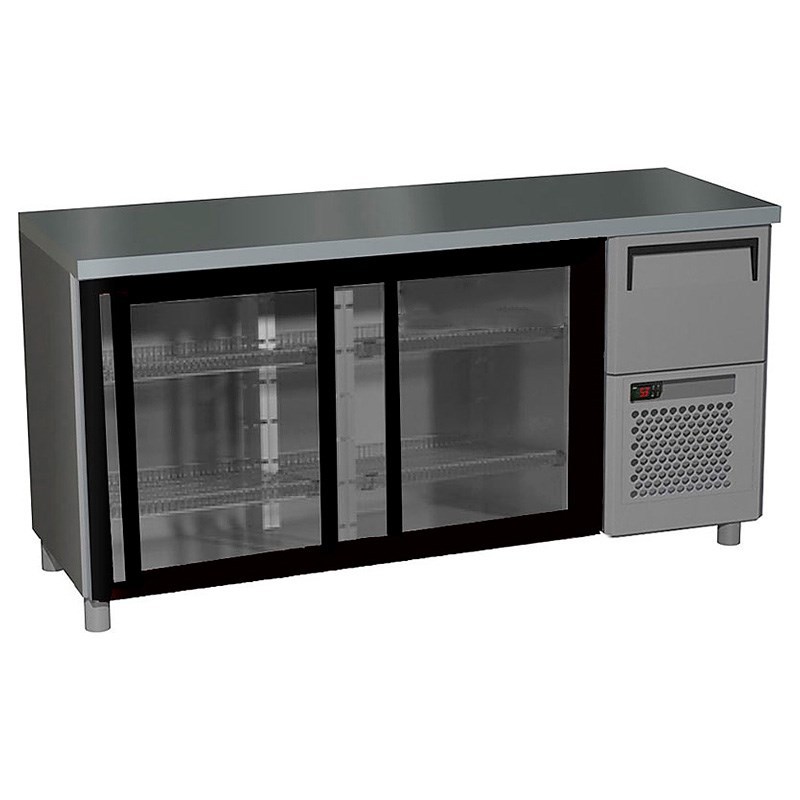 Модель оснащена 2 раздвижными дверями-купе, охлаждаемым ящиком над агрегатом, 4 полками и регулируемыми ножками высотой от 90 до 110 мм. Корпус выполнен из нержавеющей стали, дверцы — из стекла, столешница с бортом.