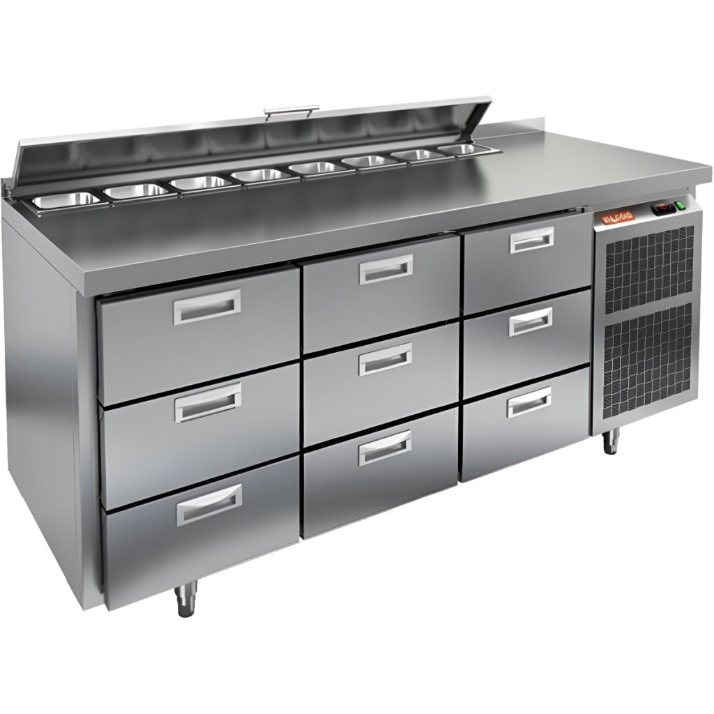 Каталог оборудования Холодильное оборудованиеСтолы охлаждаемыеСтолы холодильные для салатовСтол холодильный для салатов HiCold SL1-333GN (1/3) с крышкой Стол холодильный для салатов HiCold SL1-333GN (1/3) с крышкой Код товара: 064-847 Поделиться: WhatsAppTelegram СравнитьДобавить в КПВ избранное 0 305 992 ₽ В корзину 0 шт Под заказСамовывоз сегодня бесплатно Взять в кредит Купить в лизинг Получить консультацию в WhatsApp Описание Характеристики Отзывы 0 Стол холодильный для салатов HiCold SL1-333GN (1/3) предназначен для использования на предприятиях общественного питания и торговли. Он объединяет рабочую поверхность и охлаждаемый отсек, что делает его удобным решением для хранения, охлаждения и подготовки ингредиентов при приготовлении салатов, пиццы и других блюд. Такая конструкция позволяет повару работать быстрее и эффективнее, так как все необходимые продукты находятся под рукой. Корпус и столешница выполнены из прочной нержавеющей стали, устойчивой к коррозии и легко поддающейся санитарной обработке.Металлическая крышка защищает продукты от загрязнений и сохраняет их свежесть. Особенности модели: Электронная панель управления — точная настройка температурного режима. 9 выдвижных ящика — быстрое размещение и замена продуктов. Вместимость салат-бара — до 8 гастроемкостей глубиной до 100 мм. Автоматические доводчики — комфорт при загрузке/выгрузке. Легкозаменяемые магнитные уплотнители — надежная герметичность. Открытая агрегатная часть — быстрый доступ для обслуживания. Регулируемые по высоте ножки — устойчивость даже на неровном полу. Толщина столешницы, борта и теплоизоляции — 50 мм, что обеспечивает прочность и энергоэффективность конструкции. HiCold SL1-333GN (1/3) — практичное и удобное решение для профессиональной кухни, обеспечивающее удобную подготовку и хранение ингредиентов. Изображение товара, представленного на фото, может отличаться от его фактического вида. Показать все Габаритные размеры1835×700×850 ммДиапазон рабочей температурыот +2 до +10 °CРасположение агрегатаБоковое Материал столешницыНержавеющая Тип столаС ящиками Объём505 лТип гастроемкостейGN 1/3 Количество ящиков9 штНапряжение220 ВМощность0,46 кВтТип охлажденияДинамическое Тип оттайкиАвтоматическая СтолешницаС бортом Габариты в упаковке2000×850×1000 ммВес нетто130 кгВес брутто185 кгБрендHicold Оставить отзыв Еще никто не оставил отзыв на этот товар Ранее просмотрено Под заказ 235 162 ₽ Стол холодильный для салатов HiCold SLE1-222GN (1/3) О без крышки Под заказ 259 191 ₽ Агрегат компрессорный-конденсаторный МХМ БКК ZB-30 Под заказ 143 721 ₽ Стол холодильный для салатов HiCold SL1-11GN (1/3) О с крышкой