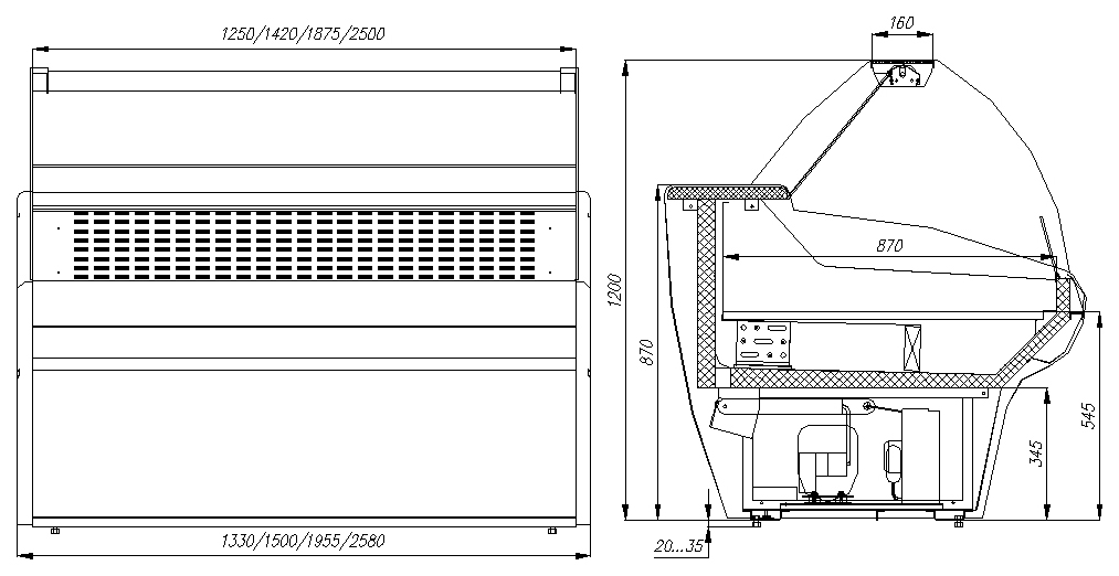 Carboma G110 VV 2,5-1 без боковин (ВХСр-2,5ш Carboma G110 (динамика)) — функциональная холодильная витрина с удобным доступом к продуктам, энергоэффективным управлением и возможностью индивидуального исполнения, идеально подходящая для предприятий общепита и торговли.