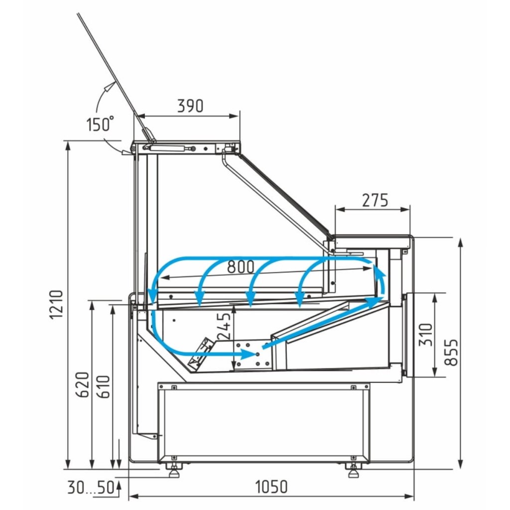 Экспозиционная поверхность и столешница изготовлены из шлифованной нержавеющей стали, декоративная фронтальная панель — из МДФ.