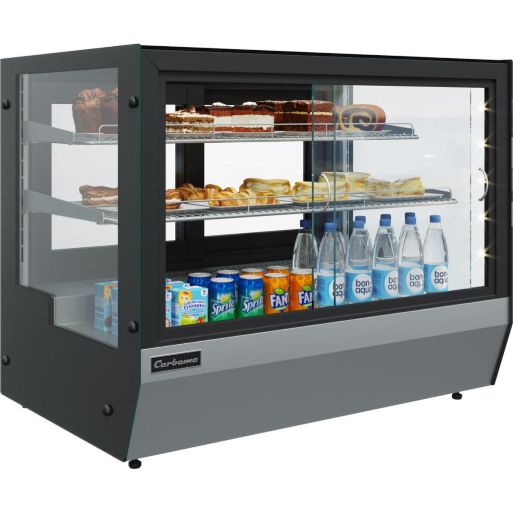 Carboma AC59 VM 1,2-1 (слайдер) (фронт стандартный цвет) — это надёжная и эргономичная охлаждаемая витрина с удобным доступом с обеих сторон, которая обеспечит качественную демонстрацию и сохранность продукции в кафе, барах и точках продаж.